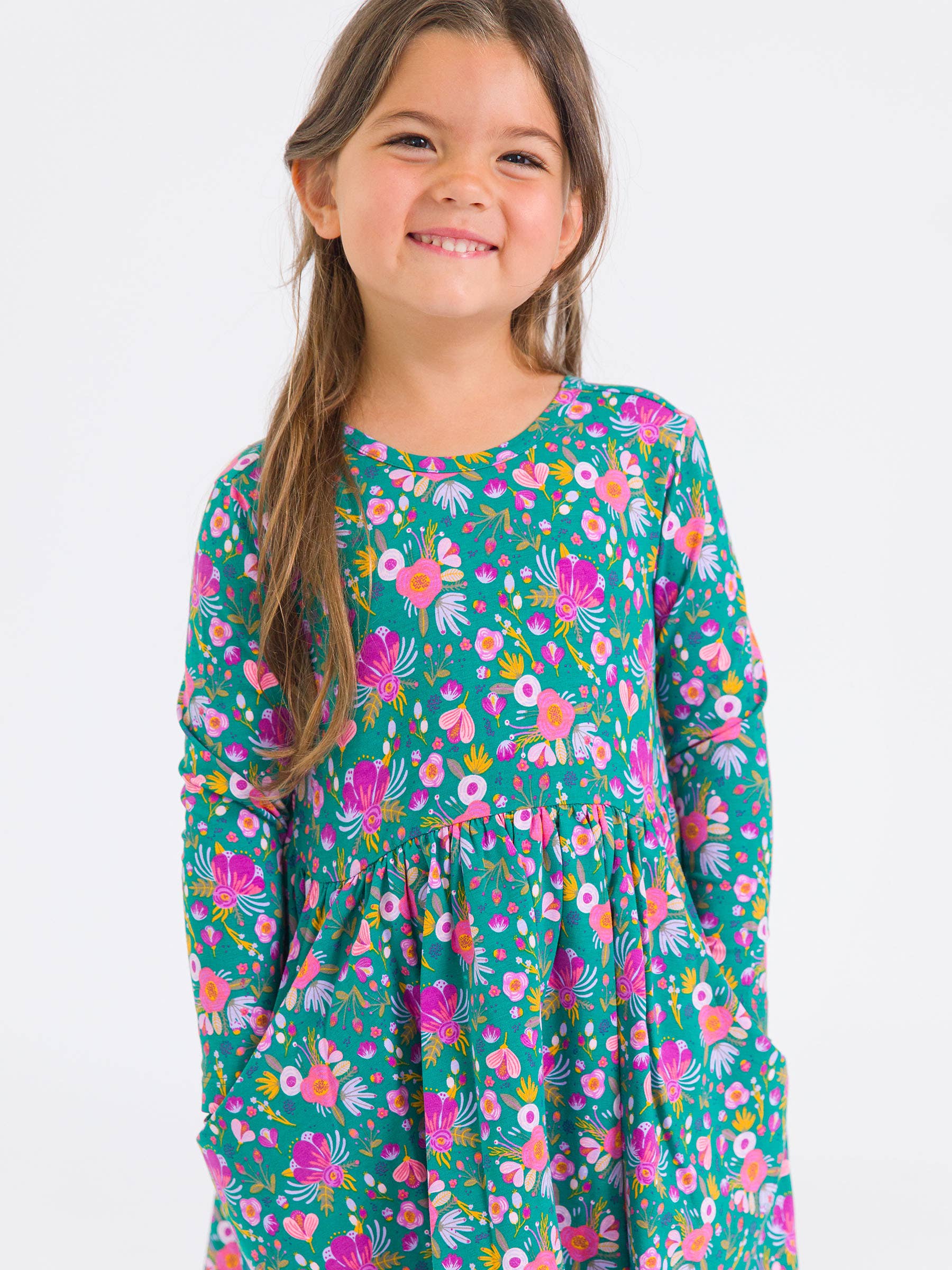Our bestselling long sleeve twirl dress is a must-have addition to any little girl's wardrobe. Crafted from high quality knit fabric, this dress is gentle on skin, ensuring a comfortable fit and easy wear. Functional pockets make it practical, and a sweet bow accent on the back adds the perfect girly touch! The jewel-toned floral print is perfect for sweet fall outfits! Care Instructions: Machine wash cold; only non-chlorine bleach when needed; tumble dry low Fabric Content: 95% Cotton,5% Spandex
